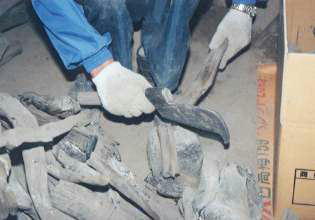 鉄のように堅い備長炭はノコギリでは切断できず、ナタで叩いて切断する。